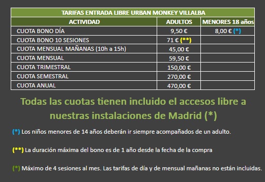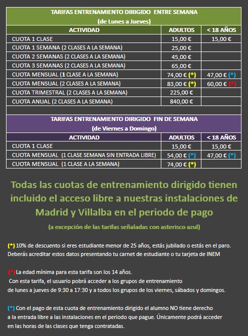 Las cuotas de por libre permanecerán igual que este año, pero las cuotas de entrenamiento dirigido tendrán una ligera subida. Puedes consultar los nuevos precios de nuestro centro de Madrid y Villalba en las imágenes de más abajo.